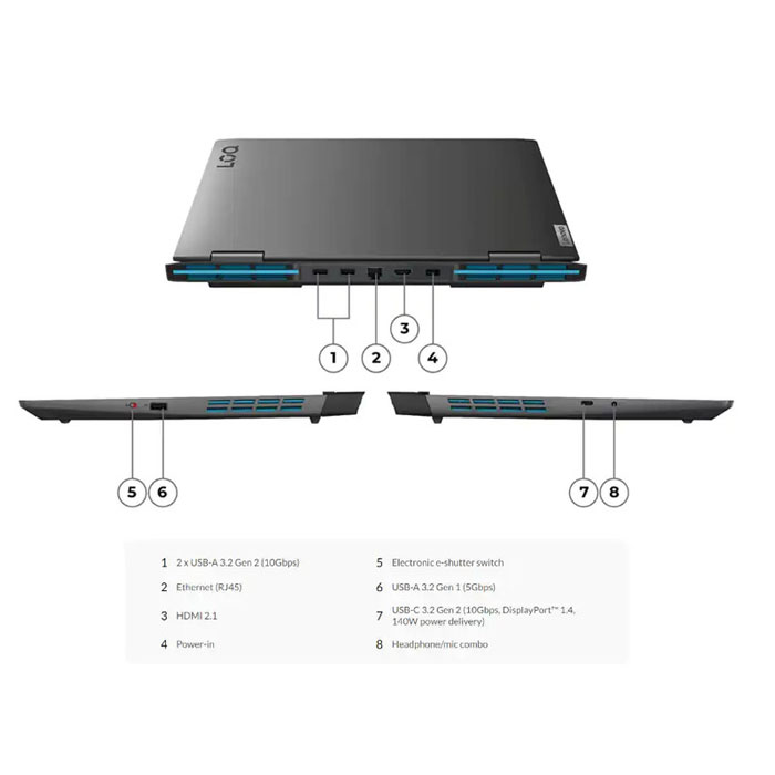 لپ تاپ لنوو مدل LOQ 16IRH8 دارای اتصالات متعدد و متنوعی است که این امکان را به شما می دهد که با سایر شبکهها و دستگاهها ارتباط برقرار کنید. این لپ تاپ دارایشبکه بیسیم WiFi، بلوتوث، پورت شبکه، پورت HDMI و جک هدفون/میکروفن است.